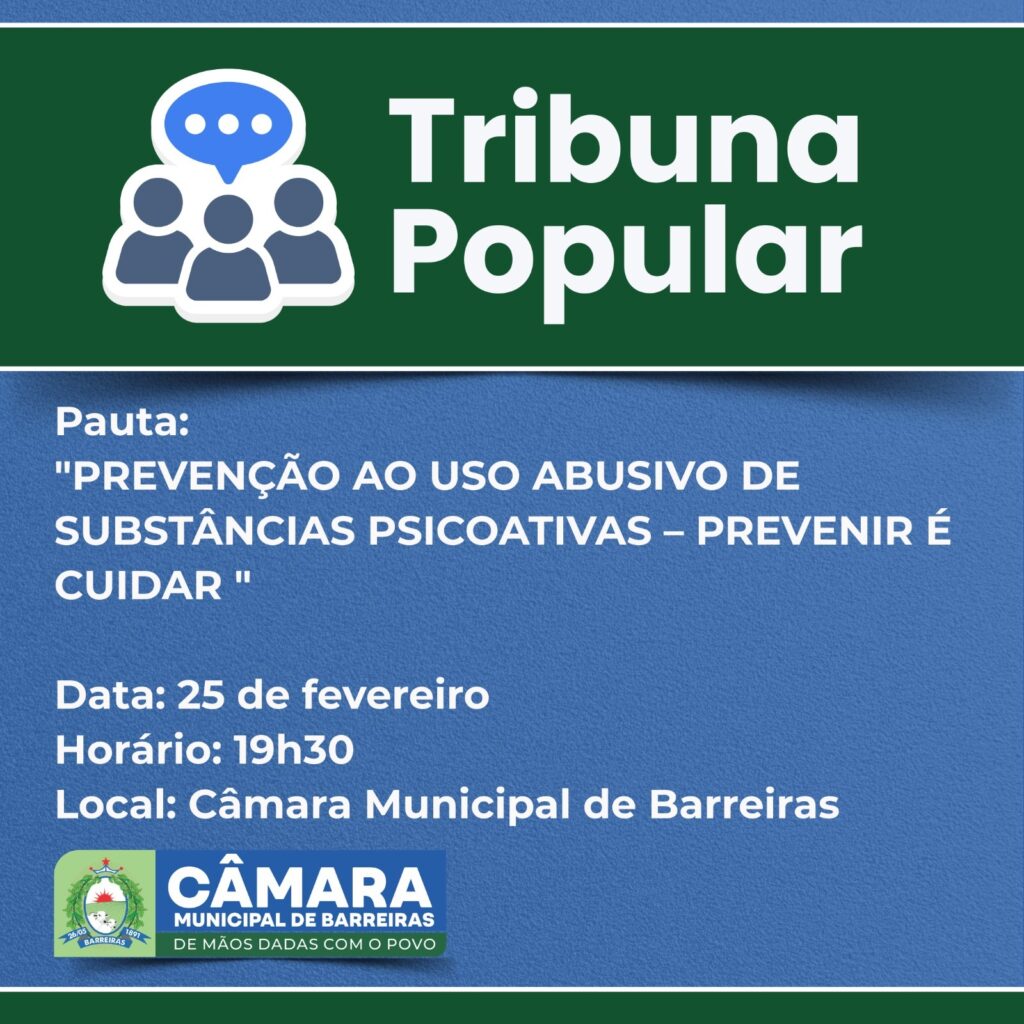 ASCOM Delmah Pedra – A vereadora Delmah Pedra promove, nesta quarta-feira (25), às 19h30, a Tribuna Popular com o tema “Prevenção ao uso abusivo de substâncias psicoativas – Prevenir é cuidar”. O evento, aberto à comunidade, acontece na Câmara Municipal de Barreiras e representa um desdobramento prático do trabalho legislativo da parlamentar na área da prevenção às drogas.